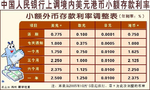中國人民銀行決定自2005年10月15日起上調境內商業(yè)銀行美元、港幣小額外幣存款利率上限。其中,一年期美元、港幣存款利率上限均提高0.5個百分點,調整后利率上限分別為2.5%和2.375%(詳見附表)。