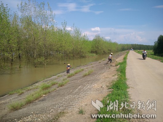 在接興村附近堤段,48歲的村民駱傳見(jiàn)正在為自家的責(zé)任堤段除草。他介紹,按照防汛要求,必須將雜草清理干凈,方便巡查。說(shuō)話間,他接到電話通知,明天參加巡堤值守。