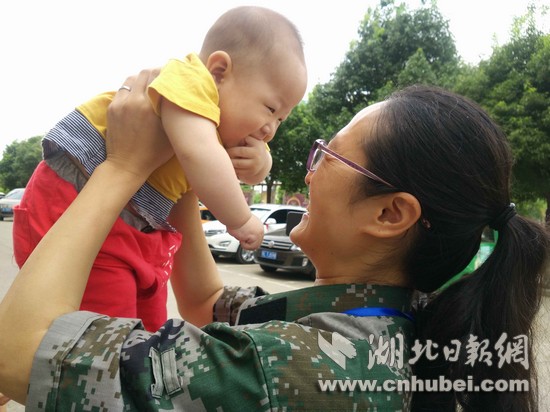 湖北日?qǐng)?bào)網(wǎng)訊(全媒體記者 張愛虎 通訊員 江開群 秦修)6日上午8時(shí)30分,嘉魚縣陸溪鎮(zhèn)鎮(zhèn)長路紅云,到縣防指辦理防汛物資報(bào)領(lǐng)手續(xù),忙完后下樓,正是9時(shí)10分,見到婆婆抱著5個(gè)多月的兒子蕗熙趕來。乘著采訪的間隙,一身戎裝、皮膚黧黑的路紅云抱著兒子逗玩。