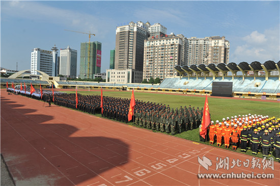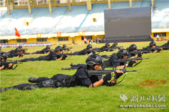 在警務(wù)技能演練之后,武警支隊、特警支隊和赤壁市公安局等單位60名民警,進(jìn)行了反暴恐合成作戰(zhàn)演練:公交車上制服歹徒、排爆員移除可疑爆炸物、狙擊手制服恐怖分子、談判專家現(xiàn)場喊話確保人質(zhì)安全……短短10多分鐘,各警種精誠合作,成功處置一起暴恐事件。隨后,民警和消防官兵又先后進(jìn)行了重大交通火災(zāi)事故救援處置、突發(fā)事件應(yīng)急處置綜合演練。