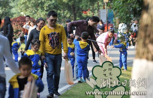 出發(fā)后,父母帶領(lǐng)著孩子們在十六潭公園進行3公里徒步,途中看到垃圾就夾起來放進垃圾袋里。幼兒園的老師們領(lǐng)著孩子們唱《大王叫我來巡山》《哇哈哈》歌兒,還喊起活動口號,歡樂不斷。