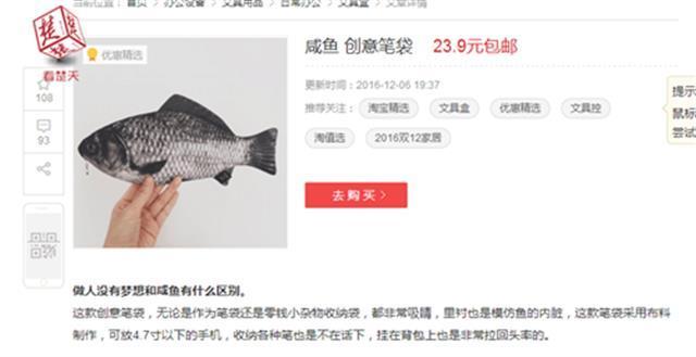 據(jù)了解,“咸魚”筆袋的主人是個初一孩子,記者聯(lián)系他的媽媽后得知,筆袋是孩子在網(wǎng)上挑選后,她購買的?!安恢浪麨槭裁聪矚g這個筆袋?!笔潞?,記者在淘寶、京東上搜索“咸魚筆袋”后,也確實發(fā)現(xiàn)了類似的筆袋。