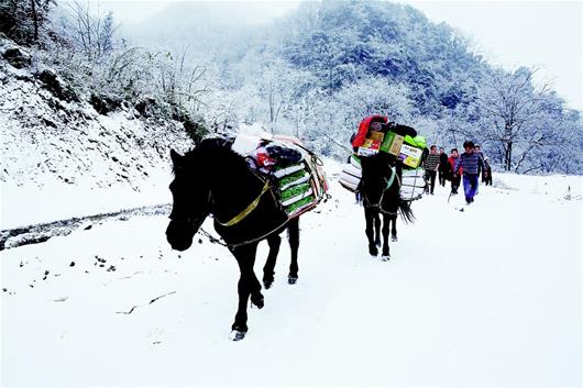 湖北日?qǐng)?bào)訊 因大雪封山,1月28日,崇陽縣銅鐘鄉(xiāng)大嶺村一組15戶20余村民,多是70歲左右的老人,被困海拔近千米的深山內(nèi),生活物資告急。該鄉(xiāng)立即組織馬幫將大米、方便面、油、蠟燭等物資送進(jìn)山。