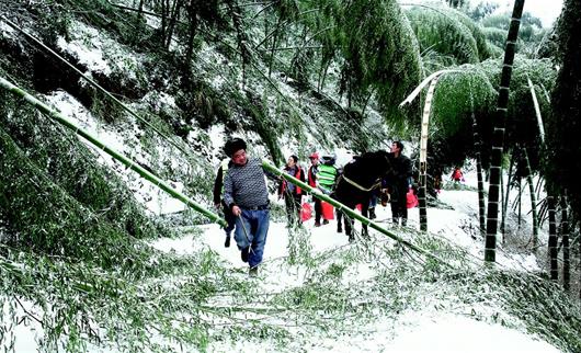 中午12時(shí)30分許,救援隊(duì)一行30余人出發(fā)。上山的路雖然是公路,但積雪很厚,最深處10余厘米,加上結(jié)冰,可謂步步艱難。一路上,被大雪壓斷的楠竹不時(shí)阻斷道路,救援隊(duì)專門請(qǐng)來三名村民,提前砍竹清障。大家跟著馬幫師傅,小心翼翼通過危險(xiǎn)路段。