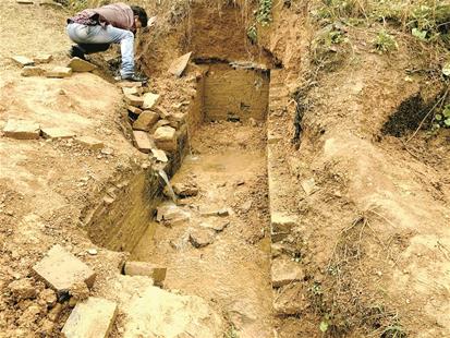 昨日上午,楚天都市報(bào)記者驅(qū)車來(lái)到該村,被盜的古墓離孫師傅家約有1公里路程,他帶著記者翻山來(lái)到現(xiàn)場(chǎng)。記者現(xiàn)場(chǎng)看到,該墓在一條公路邊上,墓穴已被挖開,長(zhǎng)約3米,寬約70厘米,墓室由青磚砌成。青磚比普通磚要薄,有的青磚上還有花紋。