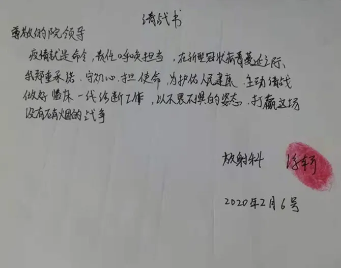 在疫情最緊急的時候,全院200多位醫(yī)護人員主動請纓加入“戰(zhàn)斗”,一筆筆簽名,一個個紅手印,彰顯的是責任,是面對疫情時絕不退縮的堅強擔當!