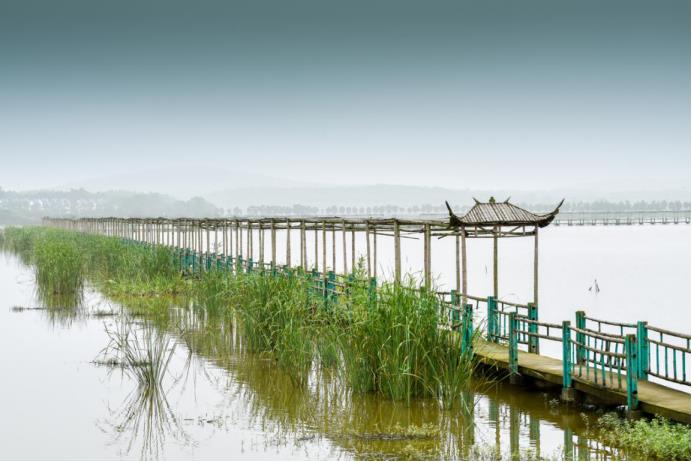 當(dāng)天,木制釣魚臺(tái)上,一位50余歲的游客在休閑小釣。垂竿拋,紅煙斂,大有一番“人疑天上坐,魚似鏡中懸”的味道。也有三兩游客櫓槳戲水,一不小心,驚擾了覓食的魚兒,“潑刺”一聲,慌亂中撲騰至遠(yuǎn)處,不見蹤影。