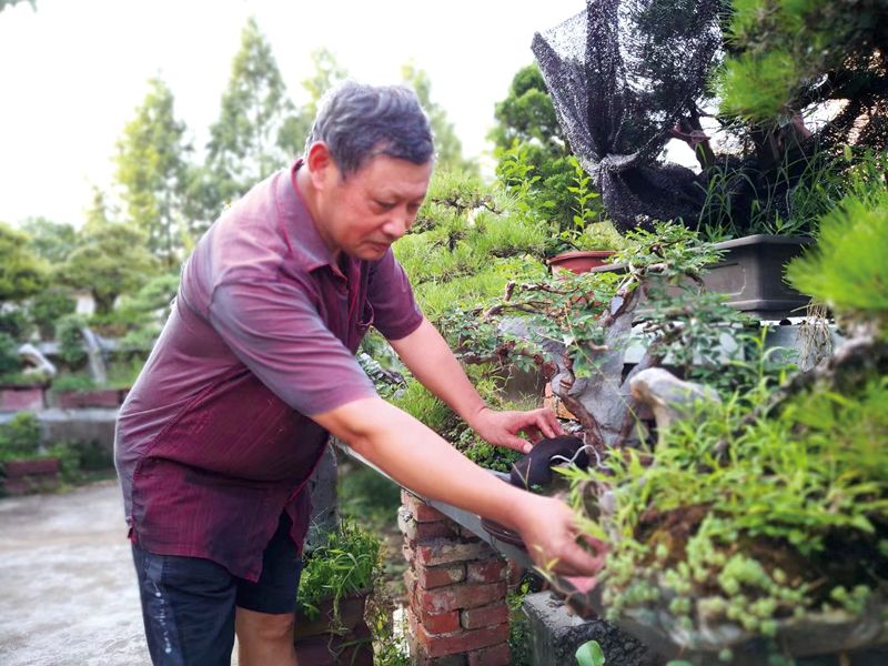 30多年來,孫勝望每天堅持下班后給盆景澆水,家里的走廊過道、院子里,平頂上密密麻麻全是擺放的盆景。最多時他的盆景達2000多盆,成了遠近聞名的“盆景大戶”。僅澆水每天就要花費半天工夫,幾乎每個晚上他都要打著手電筒堅持把水澆完。“澆水好象給嬰兒喂水,施肥好比喂奶,修枝好比剪指甲,而打農(nóng)藥則是給他們治病……”在他心目中,每一個盆景都是一個嗷嗷待哺的嬰兒,孫勝望總是悉心照料,精心呵護。