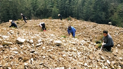 2月17日(大年初六)上午,春風輕拂,暖陽高照,年味正濃,在青山疊翠的汀泗橋鎮(zhèn)古田村十四組背底窩的一個小山坡上,傳來一片歡笑聲和鋤地聲,40余名村民正在忙著栽種杉樹苗。