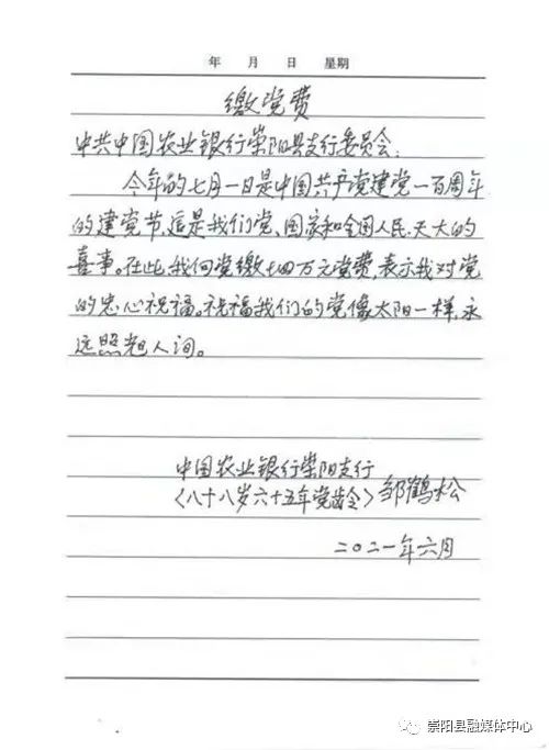 廖海峰告訴記者,來之前,鄒鶴松老人特意向中國(guó)農(nóng)業(yè)銀行崇陽支行黨委寫了一封信,信里這樣寫著:“今年是中國(guó)共產(chǎn)黨建黨100周年,這是我們黨、國(guó)家和全國(guó)人民天大的喜事。在此,我向黨繳納4萬元黨費(fèi),表示我對(duì)黨的衷心祝福。祝福我們的黨像太陽一樣,永遠(yuǎn)照耀人間?!币痪渚浜?jiǎn)單樸實(shí)的語言,彰顯著一名老黨員赤心向黨、一心為黨樸實(shí)而偉大的情懷。