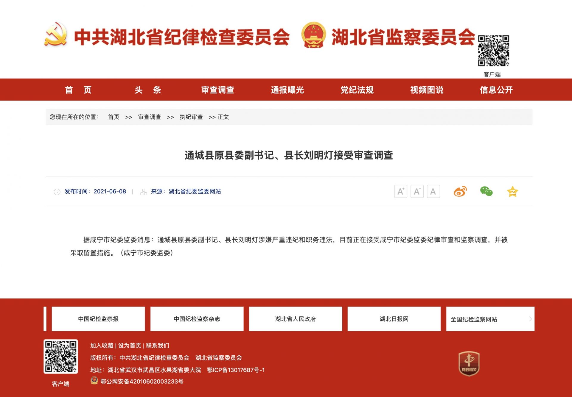 據(jù)咸寧市紀委監(jiān)委消息:通城縣原縣委副書記、縣長劉明燈涉嫌嚴重違紀和職務違法,目前正在接受咸寧市紀委監(jiān)委紀律審查和監(jiān)察調(diào)查,并被采取留置措施。