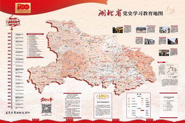 《湖北省黨史學(xué)習(xí)教育地圖》以湖北省普通地圖為底板,嵌入人物、事件和紅色資源等要素,圖文并茂,直觀呈現(xiàn)重要黨史事件和重要紅色遺跡,包含有教育地圖、建黨百年湖北大事記、省直機關(guān)黨員干部教育基地名單、習(xí)近平總書記與湖北故事、湖北籍開國將帥名錄、黨史故事二維碼等模塊內(nèi)容。其中教育地圖重點標繪了省內(nèi)烈士陵園、紀念碑、革命根據(jù)地紀念館、舊址、名人故居等重要學(xué)習(xí)教育基地,全方位、多角度地展現(xiàn)了湖北這片熱土上發(fā)生的重要歷史事件。