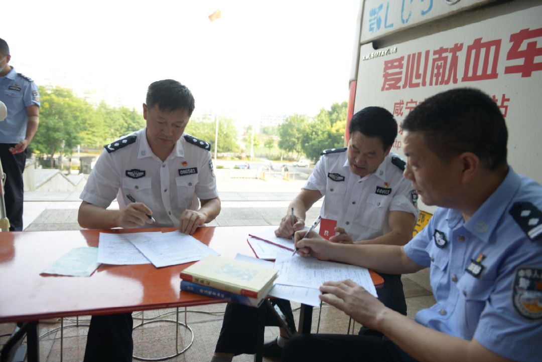 在咸寧公安主樓門廊中,聞訊趕來的民輔警整齊列隊,按照醫(yī)務(wù)人員的指引,依次進行信息登記、血液檢查、靜脈采血。有多次參加獻血的“金獎老將”,也有初次上陣的“警營新兵”,還有尚在見習(xí)期的“學(xué)警新秀”。心照不宣的接力,在新老交織中流淌、賡續(xù)、傳承,匯聚起愛的暖流!