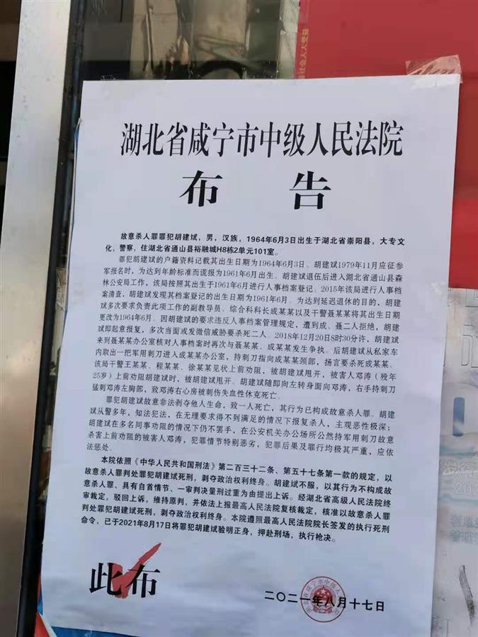 布告顯示,罪犯胡建斌因犯故意殺人罪,已于布告發(fā)布當(dāng)天,對(duì)其執(zhí)行死刑。9月5日,楚天都市報(bào)極目新聞?dòng)浾邅淼疆?dāng)事人鄧濤家中探望,在其親屬的講述和還原下,這位有血有肉的英雄仿佛再次回到人們眼前。