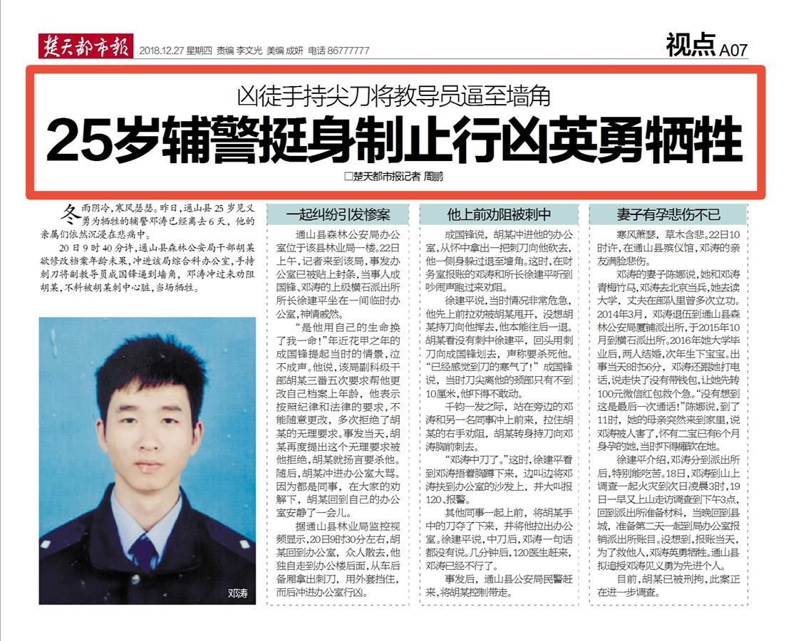 2018年12月27日,楚天都市報(bào)一篇《兇徒手持尖刀將教導(dǎo)員逼至墻角 25歲輔警挺身制止行兇英勇犧牲》的報(bào)道對(duì)這一案件進(jìn)行了詳細(xì)披露,一時(shí)間也在互聯(lián)網(wǎng)上引發(fā)強(qiáng)烈反響。之所以引起廣泛關(guān)注,只因文中那個(gè)手持尖刀的兇手,不是一個(gè)普通歹徒,而是一名人民警察。