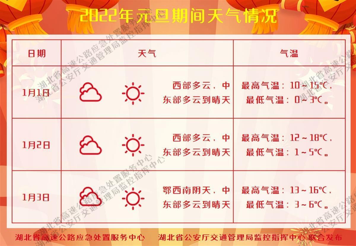 據(jù)最新氣象資料綜合分析,預計2022年元旦假期期間(1月1日至3日),湖北省西南部為多云天氣,中東部以多云到晴天氣為主,天氣總體利于出行。