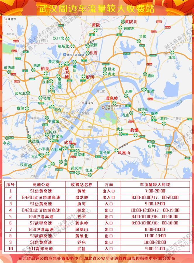 預計元旦期間,全省高速公路重點通道的車流量將顯著上升,國高網(wǎng)路段及武漢市周邊重點收費站易發(fā)生緩行情況。具體易緩行路段和武漢周邊車流量大收費站如圖所示:
