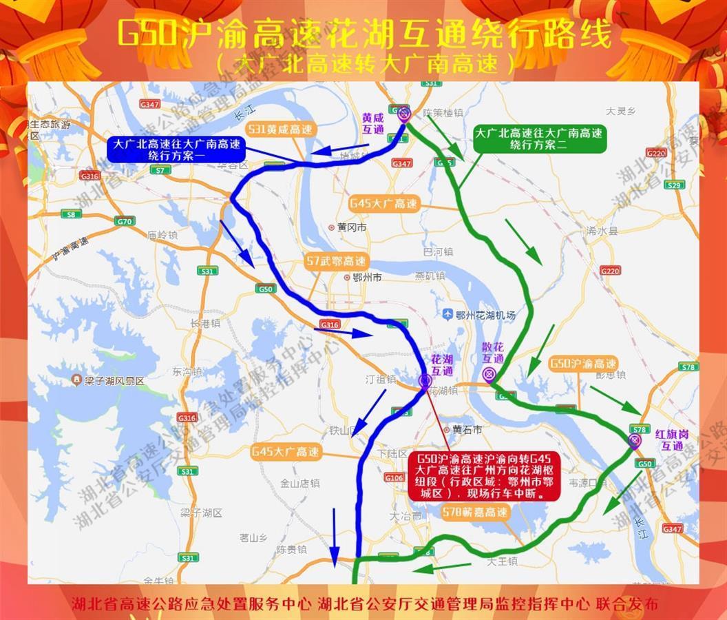 繞行路線2:G45大廣北高速散花互通—— G50滬渝高速蘄春九江方向——G50滬渝高速紅旗崗互通——S78蘄嘉高速——G45大廣南高速。