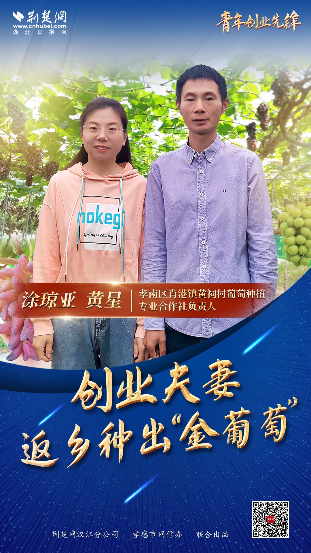 因?yàn)閷ζ咸训南矏酆筒蛔尲亦l(xiāng)土地荒蕪的信念,他扎根鄉(xiāng)野開展種植。從城市到農(nóng)村,十載堅(jiān)守,風(fēng)霜在他臉上寫滿滄桑。剪枝、除草、松土、撫育......在辛勤的耕耘中,他成長為葡萄專家。他叫黃星,他攜妻子涂亞瓊回鄉(xiāng)種植葡萄創(chuàng)業(yè),一待就是近10年。