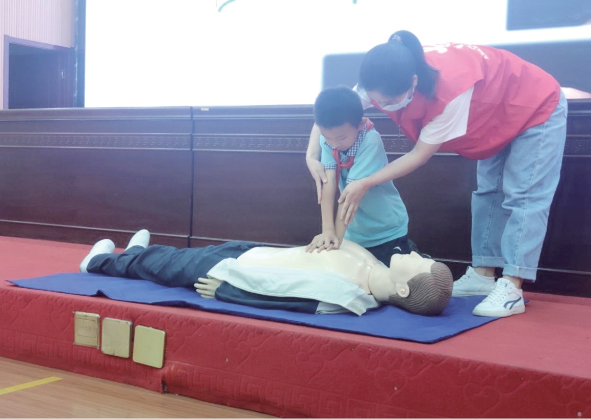 活動(dòng)現(xiàn)場,杜成芬還為大家演示了心肺復(fù)蘇術(shù)和海姆立克急救法,學(xué)生們在老師的指導(dǎo)下認(rèn)真學(xué)習(xí)演練。