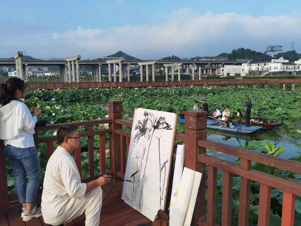 “武當(dāng)可采蓮,蓮葉何田田?!痹谖洚?dāng)山太極湖濕地公園,百畝荷花競(jìng)相開(kāi)放,微風(fēng)輕拂,碧波蕩漾,花香四溢,為炎炎夏日增添了詩(shī)意。身著漢服的古琴師帶著兩名采蓮少女,泛著小舟,暢游在花海,采摘蓮子和荷葉,為即將制作的消夏納涼荷花茶、消暑湯做準(zhǔn)備,體驗(yàn)不一樣的大暑節(jié)氣,勾勒出一幅美妙的圖畫(huà)。