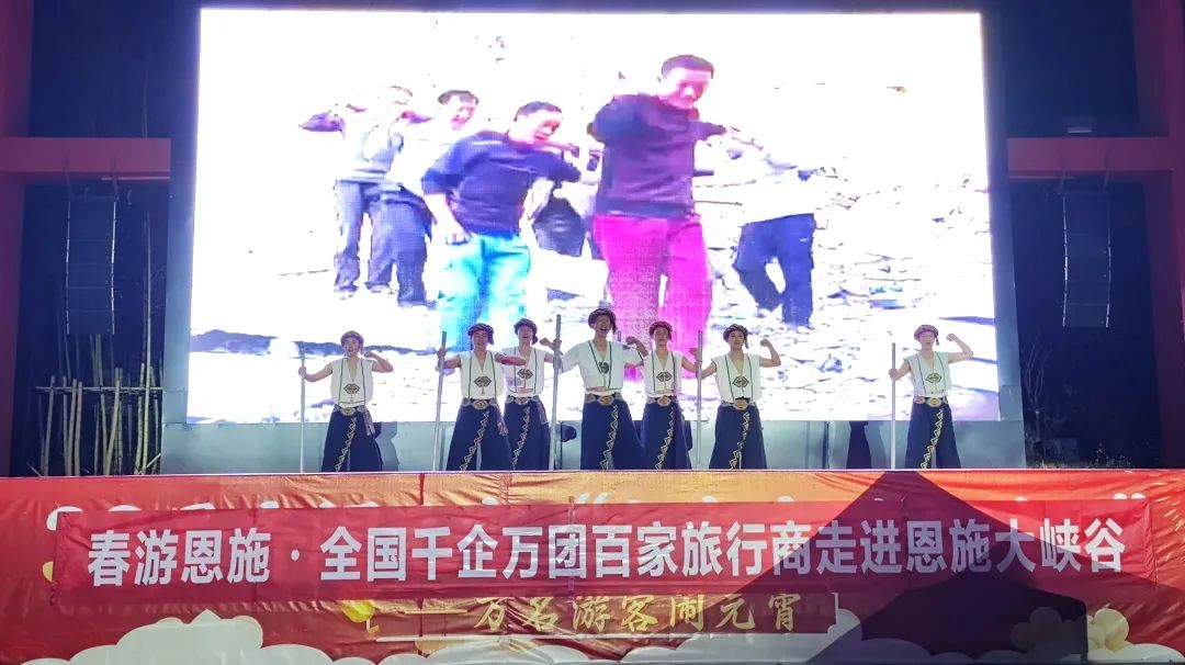 全國(guó)千企萬團(tuán)百家旅行商一行抵達(dá)恩施大峽谷景區(qū),入住女兒寨度假酒店。初春的夜晚,恩施大峽谷靜謐的山野顯得更加空靈,晚宴過后,大家齊聚女兒寨風(fēng)情廣場(chǎng)點(diǎn)燃熊熊的篝火,山歌嘹亮,舞蹈熱情,旅行商們與土家兒女齊跳擺手舞,篝火晚會(huì)現(xiàn)場(chǎng)歡聲一片。