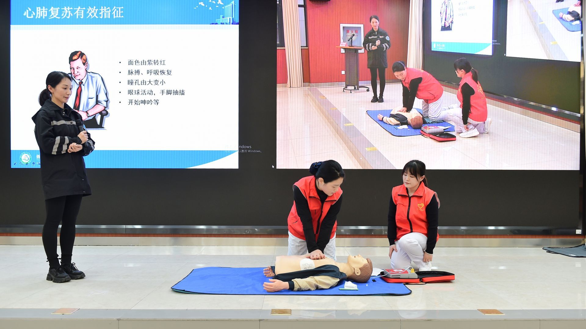省第三人民醫(yī)院肖芳應急救護志愿服務隊為大家講授心肺復蘇等急救知識,現(xiàn)場演示了自動體外除顫器(AED)和心臟按壓、開放氣道、人工呼吸等急救技能的操作流程以及注意事項。