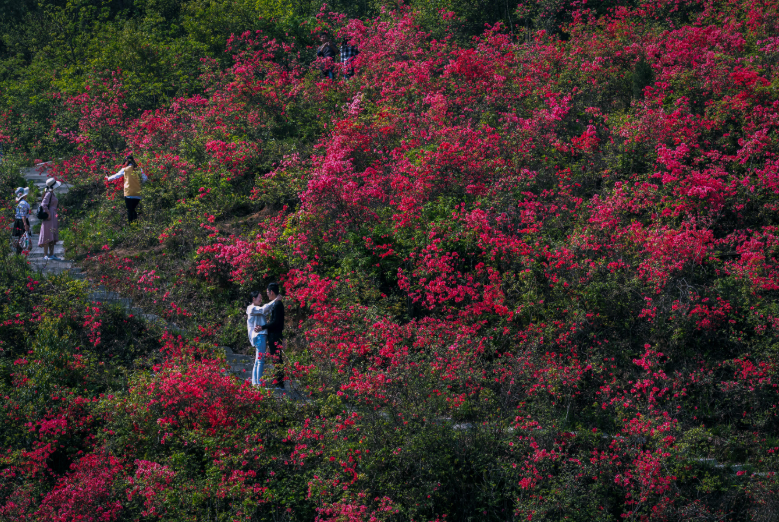 “山青花欲燃,觸目皆是花”,武漢木蘭云霧山的杜鵑花已進入盛花期。遠遠望去,1萬多畝野生杜鵑花,似錦似霞,如一幅緩緩展開的畫卷,從腳下涌向天邊,花海延綿到山峰。