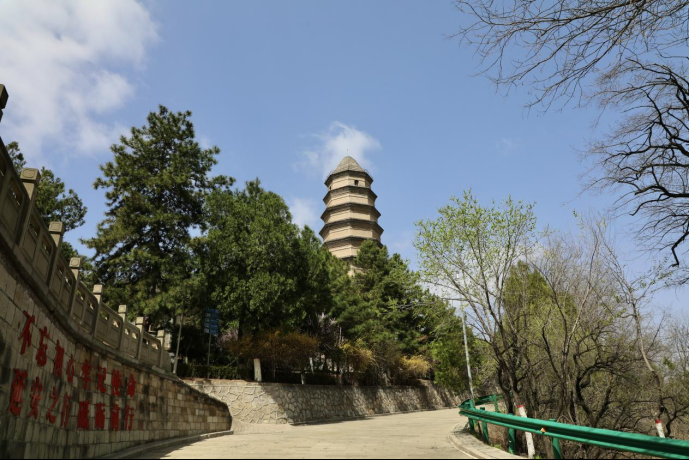 遠(yuǎn)山蒼翠,松柏挺立,隨著觀光車緩緩駛至半山腰,寶塔山巍然聳立在一片郁郁蔥蔥中。媒體團(tuán)記者們跟隨講解員的解說,仔細(xì)了解關(guān)于寶塔山傳承的延安精神,一同步行至寶塔山山頂。