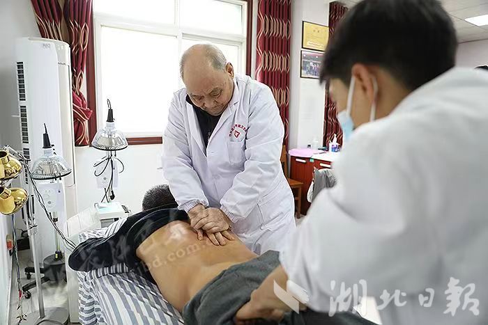 除了坐診,田先彩平時(shí)最主要的中醫(yī)傳承就是以身示范。在大支坪鎮(zhèn)衛(wèi)生院推拿室,田先彩通過親身示范、現(xiàn)場指導(dǎo),手把手教醫(yī)生陳旭推拿的位置、手法和力度。