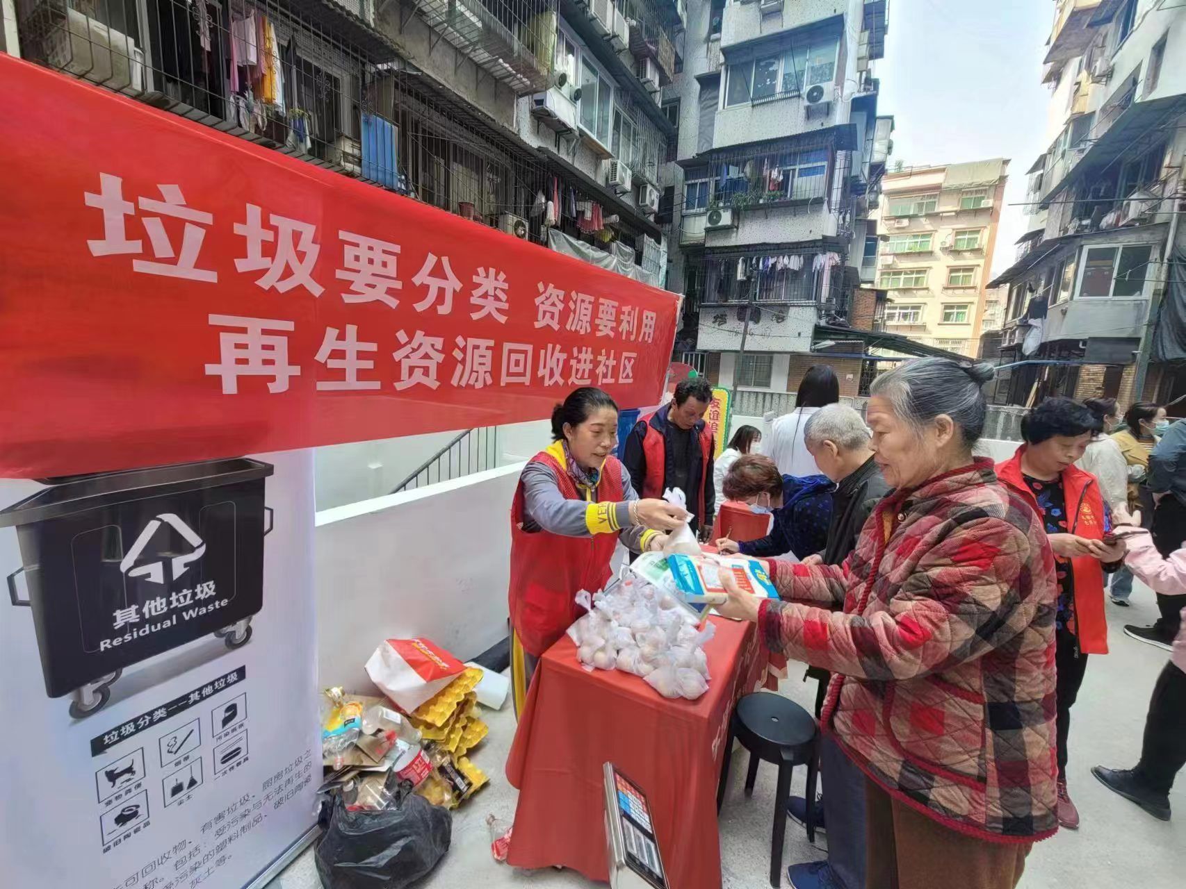活動(dòng)上垃圾分類志愿者指導(dǎo)居民按流程進(jìn)行可回收物兌換,細(xì)心地記錄每個(gè)居民兌換的可回收物數(shù)量及重量,向居民兌換相對(duì)應(yīng)數(shù)量的雞蛋和發(fā)放生活垃圾分類宣傳冊,邀請(qǐng)居民掃碼加入生活垃圾分類打卡群,并向居民宣傳生活垃圾分類知識(shí)和“戶內(nèi)分類、群內(nèi)打卡、戶外投放”新模式。