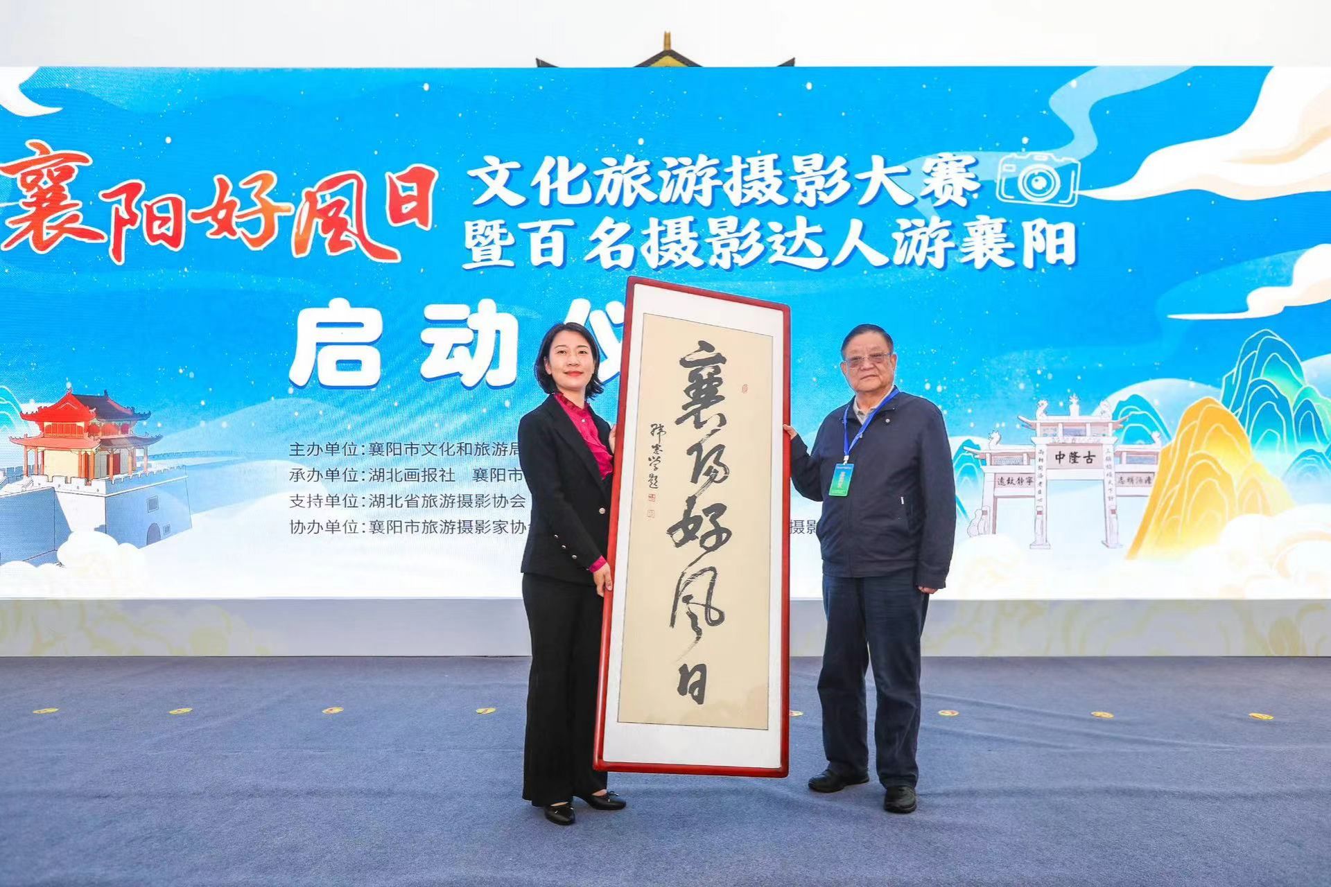 啟動儀式上,全國旅游攝影協(xié)會聯(lián)合會主席、江西省旅游攝影協(xié)會會長萬建明發(fā)言:“我們用相機定格襄陽的人文雅韻、山水之美,以旅游+攝影,攝影促旅游的方式倡導(dǎo)廣大游客愛上襄陽,玩轉(zhuǎn)襄陽,助推襄陽都市圈的發(fā)展建設(shè)。”中國攝影家協(xié)會會員、中國書法家協(xié)會會員、湖北省政府原副省長韓忠學(xué)向襄陽市文旅局局長袁曉寧贈送書法作品《襄陽好風(fēng)日》,生動演繹了攝影藝術(shù)與書法藝術(shù)聯(lián)姻的精彩瞬間。