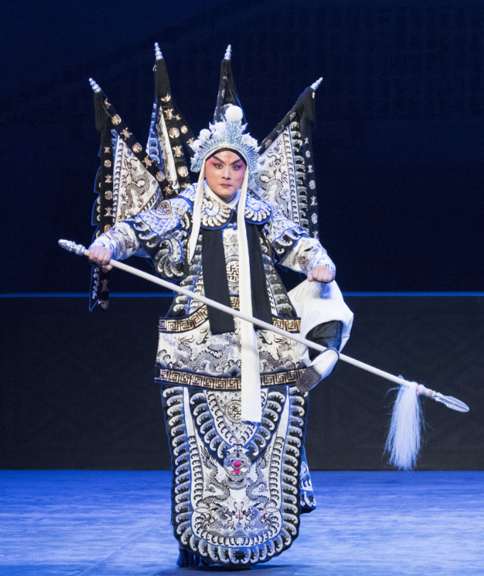 在此次奪梅劇目《馬超》中,唐愷以穩(wěn)重、沉著的功架和腰腿功,融合長(zhǎng)靠、厚底、短打、薄底,腿功、腰功、各種蹉步翻身、騰空的翻打跌撲、靠旗的抖揉轉(zhuǎn)撞和高難度的拋槍、耍槍、轉(zhuǎn)槍、背槍、繞槍?zhuān)旃?jié)奏地涮腰旋轉(zhuǎn)、擰腿翻身等功法技巧,將“馬超”這一角色完美地呈現(xiàn)展示在舞臺(tái)上。