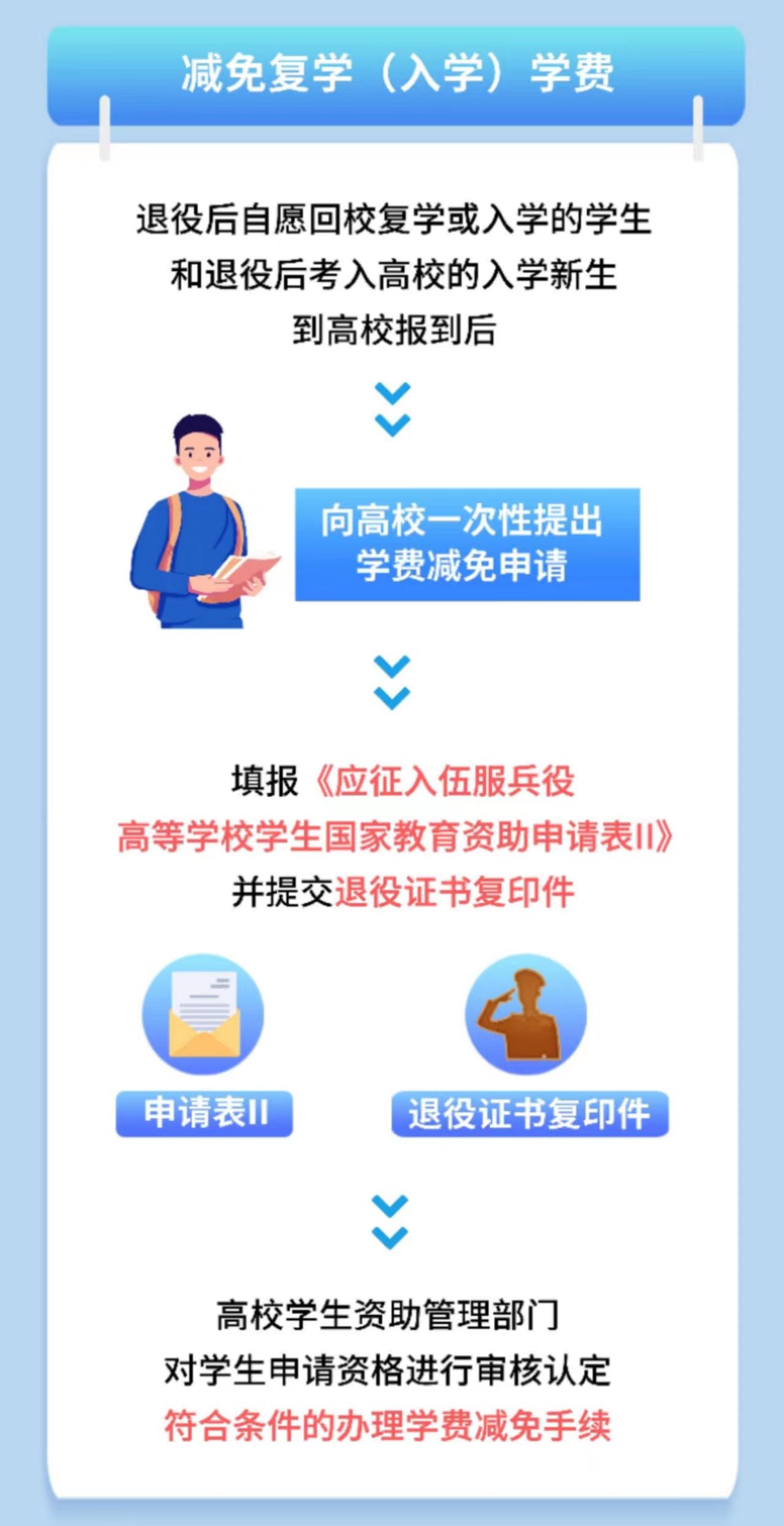 ② 對(duì)應(yīng)征入伍服義務(wù)兵役前正在高等學(xué)校就讀的學(xué)生(含按國家招生規(guī)定錄取的高校新生),服役期間按國家有關(guān)規(guī)定保留學(xué)籍或入學(xué)資格、退役后自愿復(fù)學(xué)或入學(xué)的,實(shí)行學(xué)費(fèi)減免;