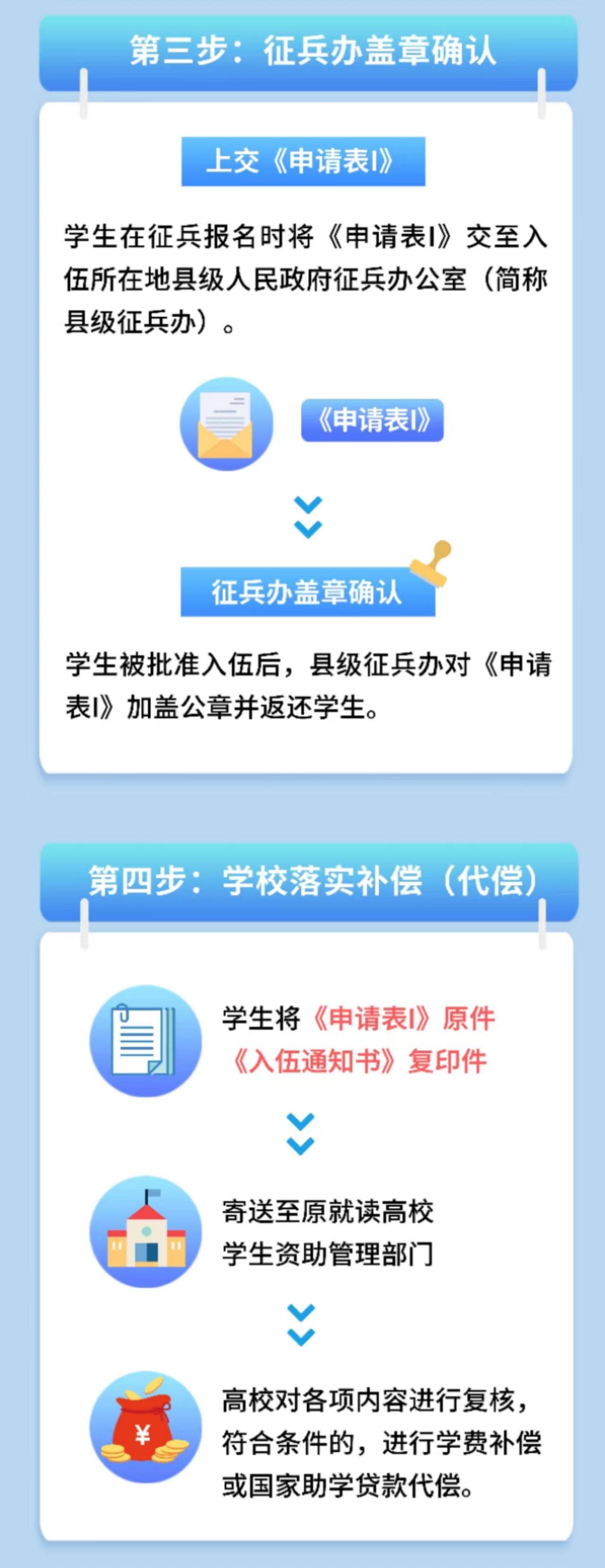 ① 國家對(duì)應(yīng)征入伍服義務(wù)兵役、招收為軍士的高校學(xué)生,在入伍時(shí)對(duì)其在校期間繳納的學(xué)費(fèi)實(shí)行一次性補(bǔ)償或用于學(xué)費(fèi)的國家助學(xué)貸款實(shí)行代償;