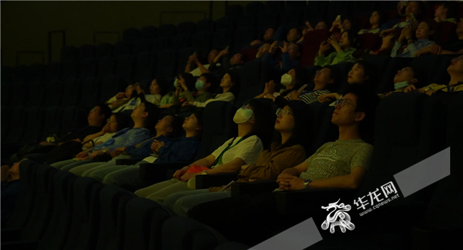 記者們?cè)谇蚰挥霸河^看大足石刻8k紀(jì)錄片。華龍網(wǎng)-新重慶客戶端 劉岱松 攝