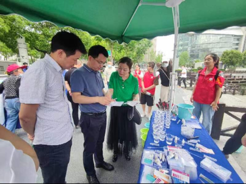 在“測測水多清”“動(dòng)動(dòng)岸更美”“我也來巡河”“我也來學(xué)習(xí)”等主題宣傳環(huán)節(jié),身穿藍(lán)色馬甲的新華街道河湖長和紅色馬甲的大學(xué)生黨員志愿者帶領(lǐng)居民在機(jī)器蕩子湖邊測試機(jī)器蕩子湖的水質(zhì)。