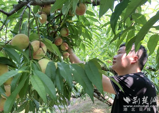 荊楚網(wǎng)(湖北日?qǐng)?bào)網(wǎng))訊(記者陶輝 通訊員付海洋 李志來)三月賞桃花,六月采桃忙。6月9日,記者來到黃州區(qū)陳策樓鎮(zhèn)張新灣村桃園基地,看見一棵棵掛滿果實(shí)的桃樹沉甸甸地彎著腰,紅彤彤的桃子掩映在綠葉之中,甚是喜人。這里新引種的狗血桃、黃桃喜獲豐收,慕名而來的游客自由采摘,歡喜滿面。