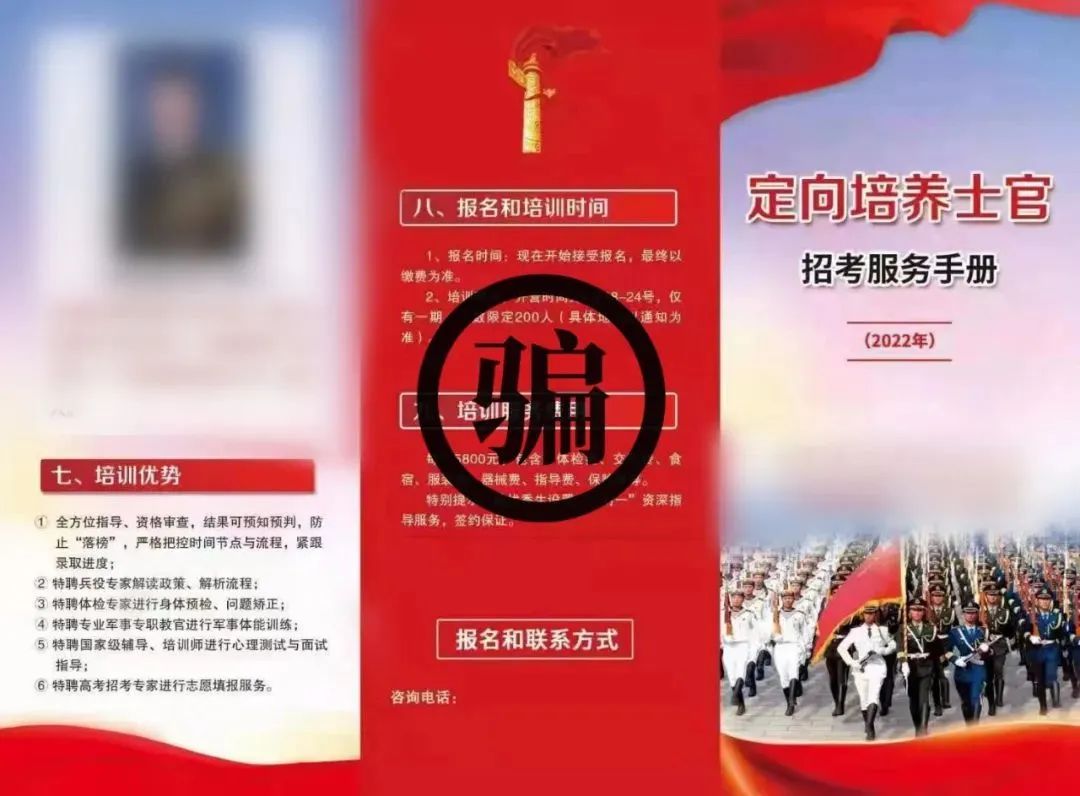 部分“培訓(xùn)機構(gòu)”甚至某些“院?!?,利用考生和家長對政策不了解,通過制作發(fā)放宣傳冊進行虛假招生宣傳。這些宣傳冊封面大都與征兵宣傳冊很相似,封面上印有“參軍”“入伍”“畢業(yè)后直接成為軍士”等字樣,還融入了軍徽等軍旅元素,報考條件甚至需要提供政治考核表等,以此為噱頭索要高額學(xué)費。