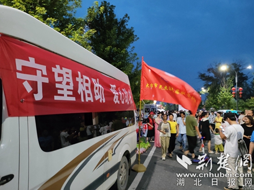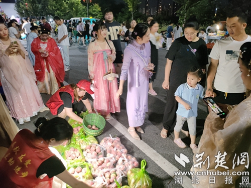 當天下午六點,大冶市靈杰國風志愿服務隊兵分兩路,分別在恒達歡樂大世界和雨潤廣場將農戶的桃子一袋袋的分揀好,早早地將夜市攤擺上,為了讓路人能直觀看到桃子的品質,他們將散裝桃子一個個切好給來往的行人品嘗。
