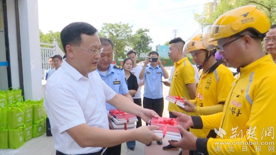 儀式上,紅安縣委常委、組織部部長余宏波向外賣騎手代表贈(zèng)送黨的二十大精神學(xué)習(xí)資料及愛心物資。