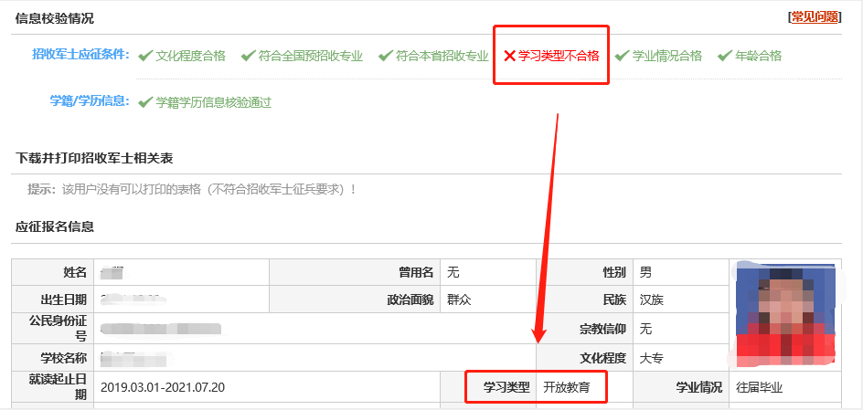 比如有的青年學(xué)歷為開放教育,故未通過: