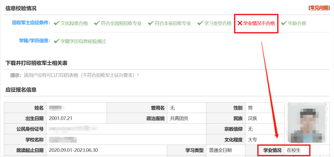 有的青年學(xué)業(yè)情況為在校生,直招軍士報(bào)名不會通過: