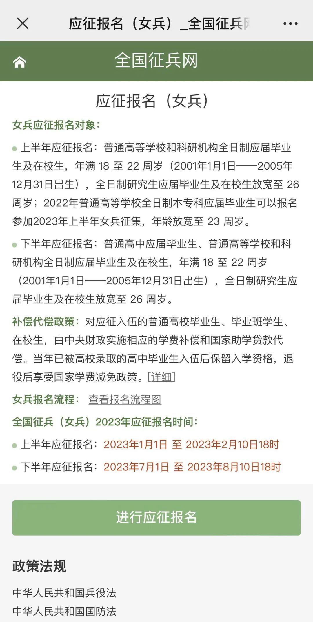 根據(jù)征集要求,2023年女兵下半年應(yīng)征報名對象為:普通高中應(yīng)屆畢業(yè)生、普通高等學(xué)校和科研機構(gòu)全日制應(yīng)屆畢業(yè)生及在校生,年滿18至22周歲(2001年1月1日-2005年12月31日出生);全日制研究生應(yīng)屆畢業(yè)生及在校生放寬至26周歲。