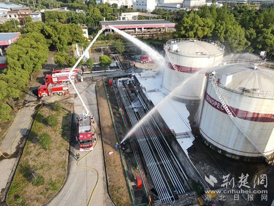此次拉動(dòng)演練設(shè)定西塞山油庫一罐體由于施工滲漏導(dǎo)致圍堰內(nèi)形成流淌火,情況危急。災(zāi)情發(fā)生后,企業(yè)立即啟動(dòng)應(yīng)急預(yù)案,并撥打119報(bào)警。市消防救援支隊(duì)按照輕型化工滅火救援編隊(duì)編成,立即出動(dòng)通信指揮、舉高噴射、滅火冷卻、戰(zhàn)勤保障4個(gè)作戰(zhàn)單元,總計(jì)16車50人。運(yùn)用防火堤池火撲救戰(zhàn)術(shù),進(jìn)行“三梯次三疊加”泡沫覆蓋,實(shí)現(xiàn)低、中、高倍數(shù)泡沫疊加覆蓋。