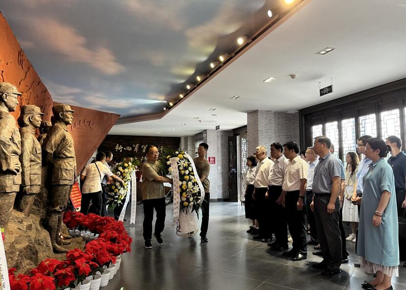 在黃陂區(qū)姚家山村紅色教育基地,全體黨員干部面向國旗,在雄壯的國歌聲中,全體同唱《義勇軍進行曲》,肅立向著國旗行注目禮,注視著國旗冉冉升起,表達著對偉大的黨、偉大的祖國最崇高的敬意。升旗儀式結(jié)束后,來自省生態(tài)環(huán)境廳和市生態(tài)環(huán)境局的4名黨員干部抬起花籃緩步走上陳列館紀(jì)念碑基座,將花籃輕輕放下,蔣茂芳專員和張朝輝局長為花籃整理緞帶,并帶領(lǐng)全體黨員三鞠躬,寄托深切哀思。
