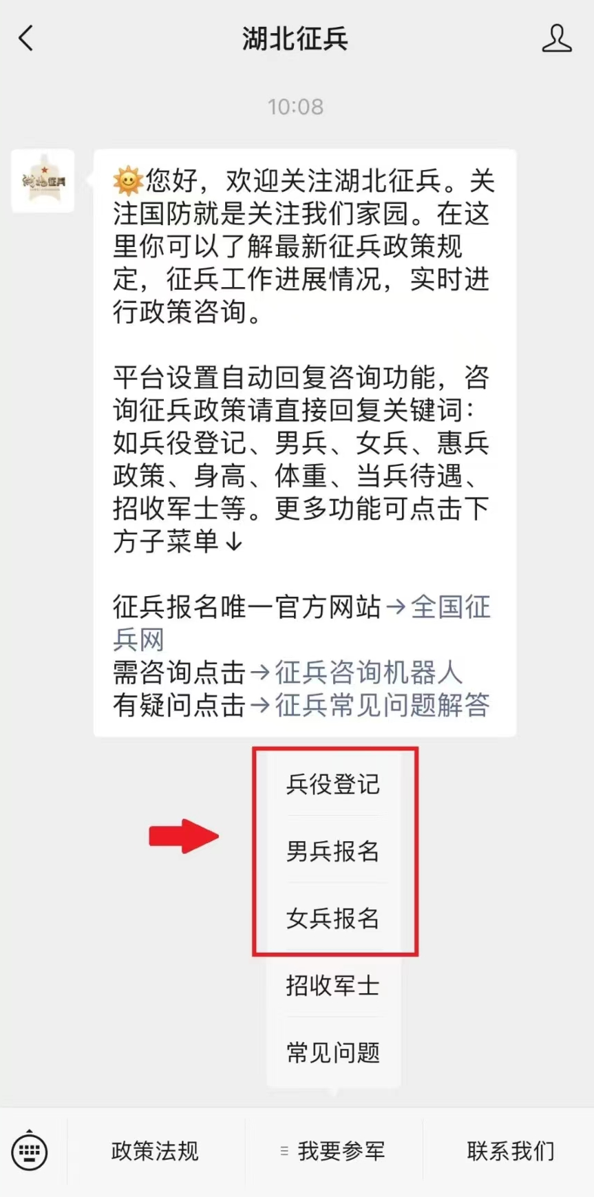 關(guān)注“湖北征兵”公眾號,點(diǎn)擊菜單欄“我要參軍”,直通報名頁面。