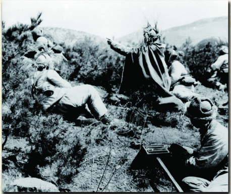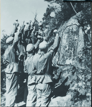 上甘嶺戰(zhàn)役中,通訊兵黃繼光主動(dòng)請纓炸掉敵人暗堡,用胸膛堵住了敵人瘋狂的火舌,用生命為部隊(duì)開辟了前進(jìn)的道路。他是第二位特級戰(zhàn)斗英雄。圖為志愿軍戰(zhàn)士在黃繼光烈士紀(jì)念碑前莊嚴(yán)宣誓。