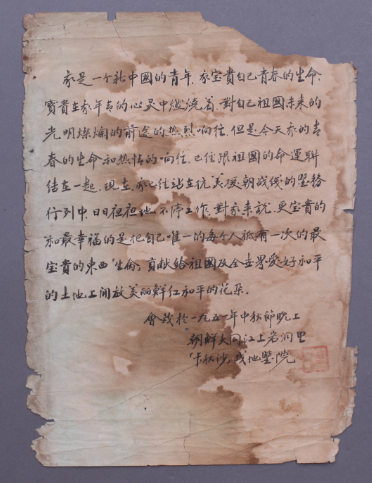 1951年抗美援朝志愿軍戰(zhàn)士在朝鮮前線寫下的帶血請戰(zhàn)書。