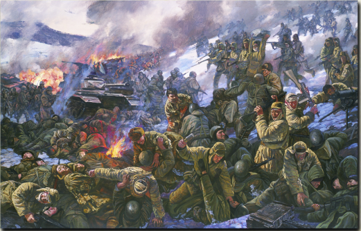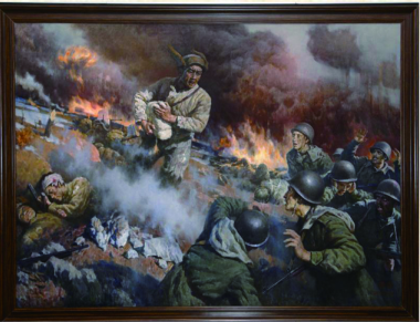 1950年11月29日,志愿軍第20軍58師172團(tuán)3連連長楊根思,率該連第3排堅(jiān)守位于下碣隅里東南的1071.1高地。美軍以飛機(jī)、火炮對高地狂轟濫炸,堅(jiān)守陣地的楊根思率領(lǐng)第3排打退數(shù)倍于己的美軍。他是抗美援朝戰(zhàn)爭中第一位特級戰(zhàn)斗英雄。圖為油畫照片:《楊根思》。